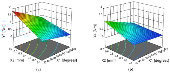 Based on Equation (16), one could observe that there is an interaction effect on the drilling torque (X1X2 > X2X3 > X1X3). The ANOVA results are presented in Table 10. In Figure 13 is presented the influence of the drill tip angle and tooth bite on the drilling torque. Equations (17) and (18) could be used to predict the drilling torque (Y4) based on the drill tip angle (X1) and tooth bite (X2).