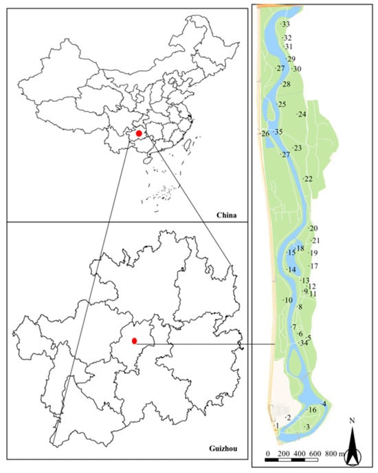 Huaxi Ten Mile Beach National Urban Wetland Park (HBUWP) stretches from Niujiao Island to Huaxi Bridge, with a total area of 4.6 km2, the longitude and latitude of which are 106°40′23.4″–106°40′59.129″ E, 26°26′20.9″–26°27′55.463″ N, respectively. HBUWP belongs to a humid subtropical climate; the annual mean temperature commonly stays at 14.9 °C, which suggests a pleasant climate without harsh winters or blistering summers. The park has a significant abundance of botanical resources, with 495 species of vascular plants and 51 species of higher plants, accounting for 27.6% of the total number of higher wetland plants in Guizhou Province (185 species). Wetland landscape resources are dominated by artificial forests with good growth conditions, and the main tree species include Metasequoia glyptostroboides, Prunus persica, ginkgo biloba, Osmanthus fragrans, Magnolia grandiflora, and Cerasus serrulata, among others. The main shrub species are Photinia×fraseri, Pittosporum tobira, Nandina domestica, Fatsia japonica, etc. The main herb plants are Lolium perenne, Poa pratensis, Iris tectorum, Gladiolus gandavensis, Trifolium repens, and Euryops pectinatus, among others.