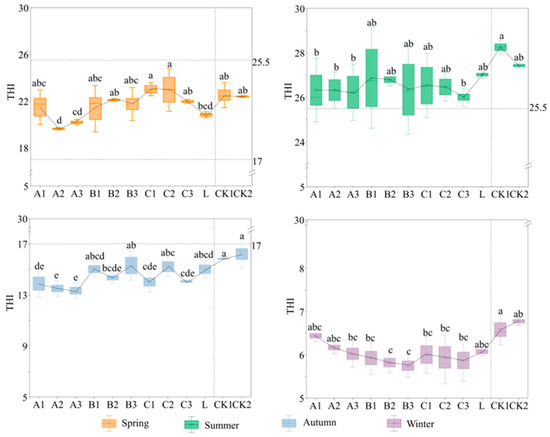 In the spring, the plant community was classified as class Ⅲ. The level of physical comfort was determined to be “comfortable” (Table 1 and Figure 2). The THI value of C1 was found to be the highest (23.04), while the value of A2 was the lowest (19.64) and the values of A2 and A3 were significantly lower than those of the rest of the plant community (p < 0.05). In the summer, the overall comfort level was usually low, which suggests a physically uncomfortable environment for the public. The lowest THI value was C3, which reached 26.01, while the highest THI value (27.02) was determined to be L. The THI values for A1, A2, A3, and C3 were considerably lower than those of the control group (p < 0.05). In autumn, the lowest THI value was observed for the A3 (13.34), while the highest THI value was found for the B3 (15.30). The fluctuations of THI in winter (0−1.45) were relatively small, but their values were significantly lower than those in other seasons, which suggests a physically uncomfortable environment.