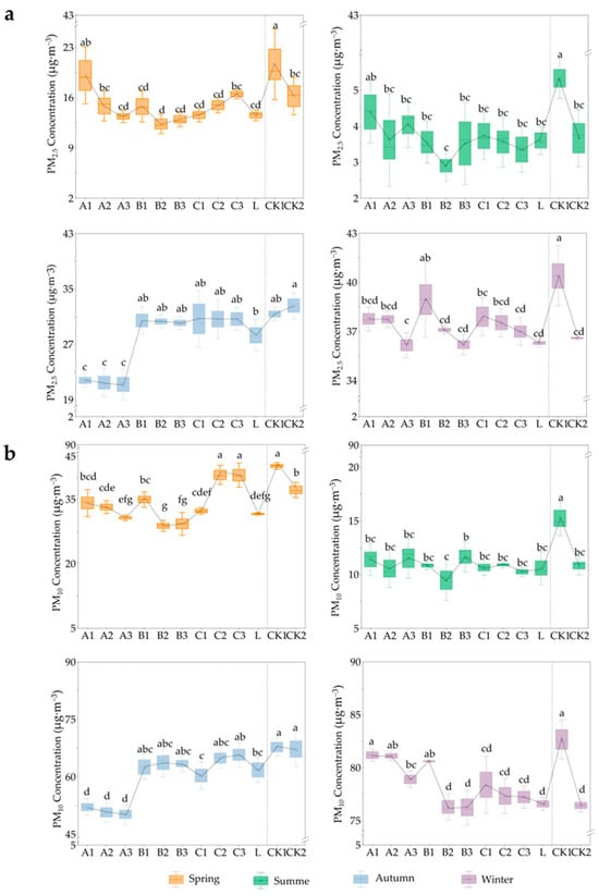 PM2.5, PM10 concentration change chart. (a) is a graph of daily changes in PM2.5, (b) is a graph of daily changes in PM10. A1: evergreen tree; A2: evergreen tree–shrub (herb); A3: evergreen tree–shrub–herb; B1: deciduous tree; B2: deciduous tree–shrub (herb); B3: deciduous tree–shrub–herb; C1: waterside trees; C2: waterside tree–shrub (herb); C3: waterside tree–shrub–herb; L: lawn; CK1: the park entrance; CK2: the hydrostatic region. Different lowercase letters indicate significant differences between different community structures at the same time (p < 0.05).
