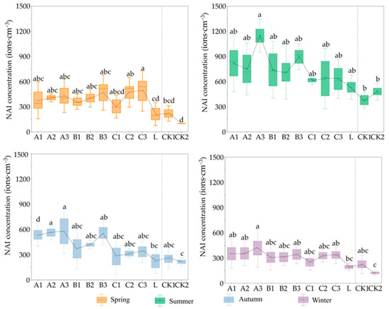 NAI concentration change chart. A1: evergreen tree; A2: evergreen tree–shrub (herb); A3: evergreen tree–shrub–herb; B1: deciduous tree; B2: deciduous tree–shrub (herb); B3: deciduous tree–shrub–herb; C1: waterside trees; C2: waterside tree–shrub (herb); C3: waterside tree–shrub–herb; L: lawn; CK1: the park entrance; CK2: the hydrostatic region. Different lowercase letters indicate significant differences between different community structures at the same time (p < 0.05).