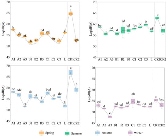 Noise change chart. A1: evergreen tree; A2: evergreen tree–shrub (herb); A3: evergreen tree–shrub–herb; B1: deciduous tree; B2: deciduous tree–shrub (herb); B3: deciduous tree–shrub–herb; C1: waterside trees; C2: waterside tree–shrub (herb); C3: waterside tree–shrub–herb; L: Lawn; CK1: the park entrance; CK2: the hydrostatic region. Different lowercase letters indicate significant differences between different community structures at the same time (p < 0.05).