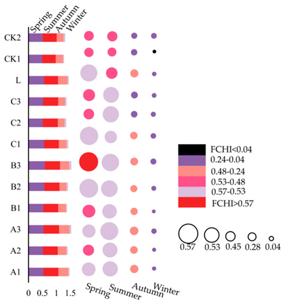 Based on the above environmental variables, a system of eco-healthcare benefit indicators was developed to gauge the eco-healthcare benefits of each plant community (Figure 6, Table 3). The results suggest that the UPCHI of the plant community reached Ⅲ levels and higher in the spring, which should be considered to be beneficial for healthcare. Among them, the UPCHI of B3 was determined to be the highest, while that of C2 was treated as the lowest. In the summer, except for L, all plant communities reached Ⅱ level, suggesting them to be “Very beneficial” for healthcare. The B3 was still the highest UPCHI value (0.55), and the lowest UPCHI was found for L. In autumn, except for C2 and C3, the other UPCHI of the plant community only reached the Ⅳ level, which suggests a “normal” healthcare benefit. The A3 had the highest UPCHI value (0.37), while the C2 had the lowest UPCHI value (0.24). In the winter, the whole community had values between the levels of V and VI, suggesting an extremely unfavorable environment for healthcare.