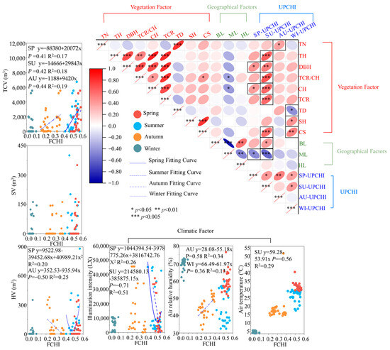 The correlations between plant, geographical, and climatic factors and UPCHI were analyzed for all seasons, and the results are given in Figure 8. In the spring, the correlation of UPCHI was confirmed to be significant with DBH, CH, TCV, ML, and illumination intensity. These correlations were positive with DBH, CH, and TCV, but negative with ML and illumination intensity. In the summer, UPCHI was significantly correlated with TH, TCR/CH, TCR, DBH, CH, CS, TCV, BL, illumination intensity, ML, and temperature. The correlation coefficients of DBH, CH, CS, TCV, and BL were positive, while the correlation coefficients of illumination intensity, ML, and temperature were negative. In autumn, the correlations between air humidity, TN, TCV, HV, and UPCHI were found to be significant. These correlations were positive for air humidity, TN, and TCV, but negative for HV. In winter, the correlations between CS, DBH, TCR, SH, and TM all had positive correlation coefficients. In addition, a significant negative correlation between UPCHI and TM was also observed.