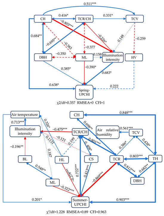 Given the higher UPCHI, spring and summer were chosen for the path analysis (Figure 6 and Figure 8). The following two well-fitting models were developed through continuous evaluation and correction of the relationships between variables (Figure 9). In the spring, CH, DBH, and illumination intensity (positive), as well as ML (negative), showed significant direct influences on UPCHI, and TCR/CH showed a significant negative indirect influence through illumination intensity, with path coefficients of 0.638, 0.385, 0.683, −0.390, and −0.226, respectively. In the summer, CS, TCR/CH, TH, ML, HL, air temperature, and TCR showed a direct influence on UPCHI, with path coefficients of 0.413, 0.722, 0.903, −0.322, −0.278, 0.201, and −0.869, respectively. Surprisingly, the TCV was shown not to have a direct influence. Furthermore, BL and illumination intensity demonstrated an indirect influence on UPCHI via numerous pathways. Illumination intensity and air temperature were the most significant, with path coefficients of −0.196 and 0.713. It is important to note that DBH has no influence on UPCHI. Finally, the summer plant component had a critical influence on illumination intensity.