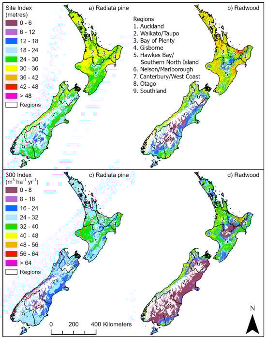 Spatial variation in site index for (a) radiata pine at age 20 and (b) redwood at age 30 and 300 Index for (c) radiata pine and (d) redwood. The boundaries and names of the nine regions used within this study are shown.