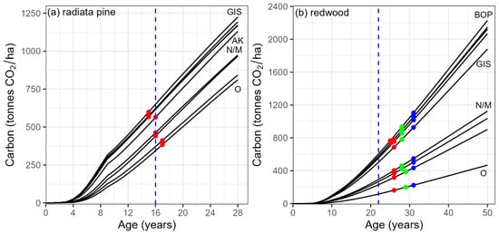Comparisons were made between redwood rotation lengths of 40, 45, and 50 years to determine the impact of the rotation length on profitability. The shortest rotation length of 40 years represents the age at which a significant proportion of durable heartwood is expected to develop. Following standard practice, a rotation length of 28 years was assumed for radiata pine. The simulations included four sequential rotations for radiata pine and three sequential rotations for redwood to ensure that the financial metrics were robust. Carbon was estimated over the entire first rotation for both species (Figure 2) to quantify how accurately the legislated averaging ages for radiata pine (16 years) and redwood (22 years) represented the mid-point of carbon accumulation over the first rotation. Following this comparison, carbon was predicted to these legislated averaging ages. Additional simulations were undertaken for redwood that accumulated carbon to the actual carbon mid-point for the three different rotation lengths (Figure 2).