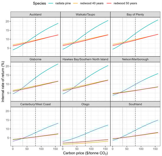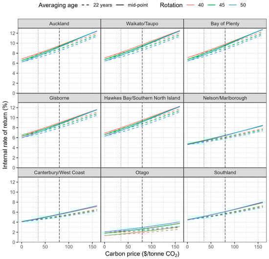 Over recent years, there has been a rapid increase in the carbon price from 25 NZD/tonne CO2 in 2019 to nearly 90 NZD/tonne CO2 by November 2022. In this study we assumed a base real value of 80 NZD/tonne CO2, which reflects the average carbon price throughout the latter half of 2022. Sensitivity analyses investigated the impact on IRR of changes in real carbon prices using values ranging from 0 to 160 NZD/tonne CO2 that were equally spaced at a resolution of 1 NZD/tonne CO2. The lowest value in this series (0 NZD/tonne CO2) represented a regime where revenue was only derived from timber. Although values between 0 and 35 NZD/tonne CO2 were likely to be very conservative as the New Zealand Government has recently set a floor price (minimum value below which units will not be sold) of 35 NZD/tonne CO2 [], they were included in the analyses for completeness and to ensure that the results could accommodate any future changes in legislation. The maximum value (160 NZD/tonne CO2) was the assumed value of carbon in 2035 by the Climate Change Commission [].