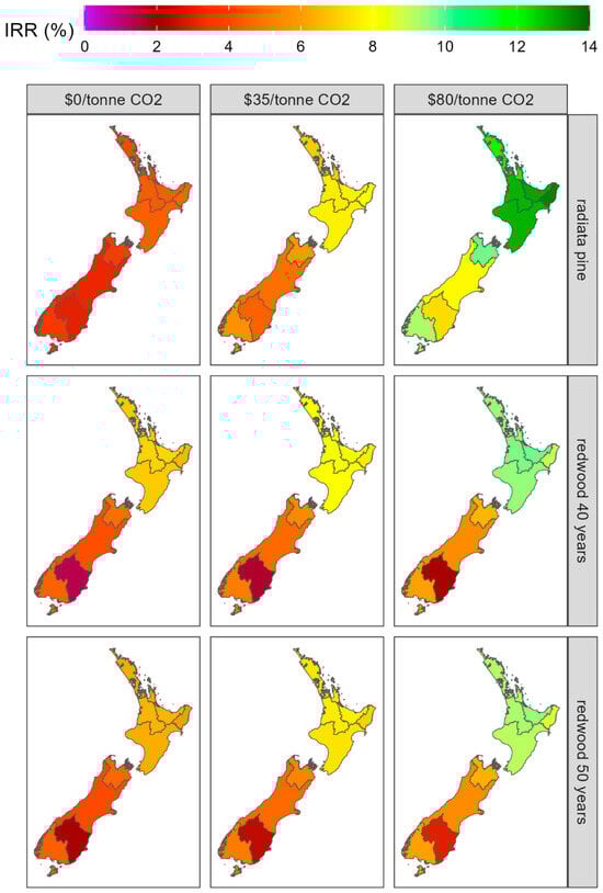 Spatial variation in internal rate of return (IRR) for (top row) radiata pine and redwood with a rotation length of (middle row) 40 years and (bottom row) 50 years. The IRR for all scenarios was determined for carbon prices of 0 NZD/tonne CO2 (i.e., timber-only regime), 35 NZD/tonne CO2, and 80 NZD/tonne CO2, with mid-point averaging undertaken for these last two carbon price scenarios.