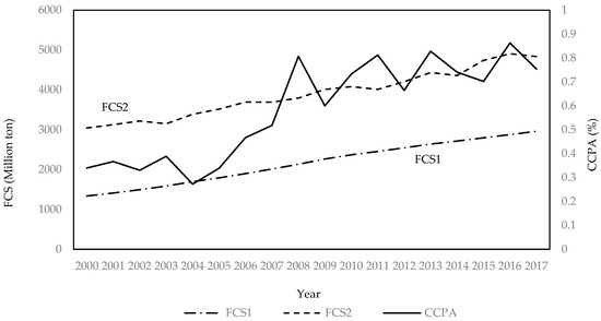 The existing literature has accumulated a certain amount of research on the calculation of forest carbon stocks [37,38,39]. We adopt two authoritative indicators, called and , to represent forest carbon stocks. is based on the research approach introduced by Xu et al. [37]. We use their estimated carbon density for existing forests and newly planted forests in China in the year 2000 to derive the forest carbon stock data for 30 provinces in mainland China (excluding Tibet) from 2000 to 2017. The specific calculation process is listed in Equations (S1)–(S3).