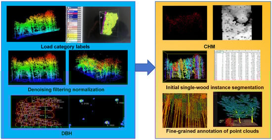 Due to the forestry environment, our dataset mainly consists of live standing trees without any buildings or pedestrian information. Therefore, our point cloud annotation method is based on single-tree localization and pre-segmentation. The method includes the following steps: loading point cloud labels, denoising and filtering normalization of the point cloud, calculating DBH (diameter at breast height) and CHM (canopy height model), pre-segmentation of individual trees in the point cloud, and fine annotation based on pre-segmentation. As shown in