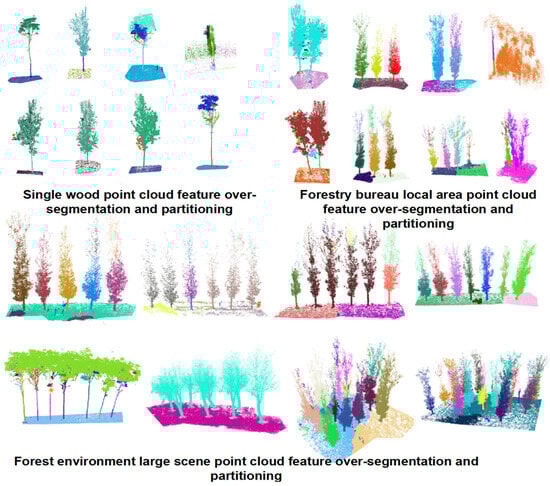 Figure 7 represents the visualization of cut point cloud features in large-scale forestry scenes, where the branches exhibit more linear characteristics (red), the crown part appears scattered (purple), and the ground part appears planar (green).