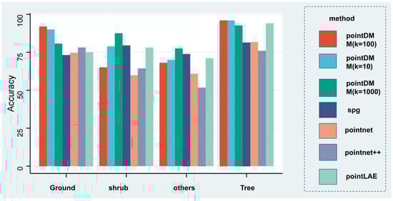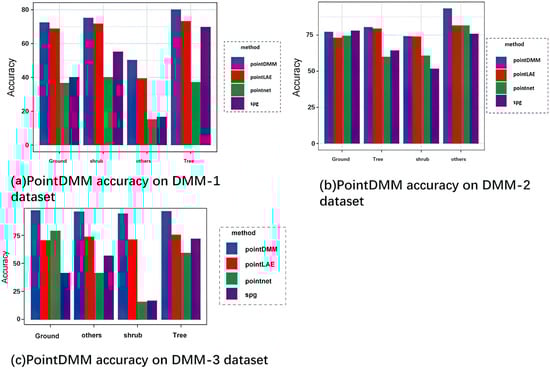 30] contains over 4 billion points and includes a variety of urban scenes, such as churches, streets, railway tracks, squares, villages, football fields, and castles. It provides detailed point cloud data scanned with state-of-the-art devices and includes eight category labels. In contrast, our dataset was collected using 16-line lidar in over 1259 scenes using a backpack-style laser LiDAR. It contains 2144 million points and is divided into tall trees, low shrubs, land, and other categories. Our dataset is further divided into three parts: DMM-1, DMM-2, and DMM-3. DMM-1 represents the point cloud of a single tree, and the original point cloud is shown in