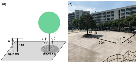 - Zheng, S.; Guldmann, J.-M.; Liu, Z.; Zhao, L. Influence of trees on the outdoor thermal environment in subtropical areas: An experimental study in Guangzhou, China. Sustain. Cities Soc. 2018, 42, 482–497. [Google Scholar] [CrossRef]