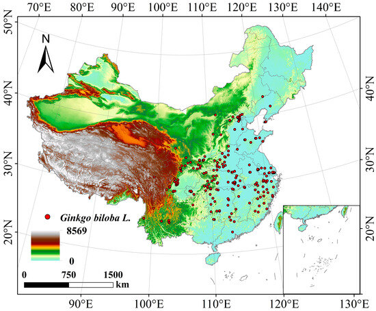 - Guo, Y. Prediction of Ginkgo Distribution and Research on Environmental Response Mechanism of Phenotypic Traits under the Climate Change; Nanjing Forestry University: Nanjing, China, 2021. [Google Scholar] [CrossRef]