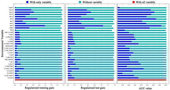 The Jackknife test can determine the predictive ability of each variable [57,58] (Figure 3). From Figure 3, the environmental variables with a larger regularized training gain are Bio6 (0.99), Bio2 (0.72), Bio13 (0.62), Bio10 (0.54), Bio14(0.50), and DEM (0.48). The environmental variables with a larger regularized test gain are Bio6 (1.06), Bio2 (0.78), Bio13 (0.70), Bio10 (0.57), Bio14 (0.56), DEM (0.50), and Bio4 (0.41). The environmental variables with a larger AUC value are Bio6 (0.87), Bio2 (0.82), Bio13 (0.81), Bio14 (0.78), DEM (0.77), Bio15 (0.74), Bio4 (0.74), T_USDA_TEX (0.72), and Bio3 (0.71).