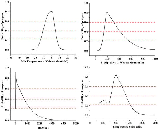Response curves of dominant environmental variables (The red dot line indicates the division of the probability of the existence of Ginkgo biloba suitable areas, from bottom to top: 0.23, 0.4, 0.6).