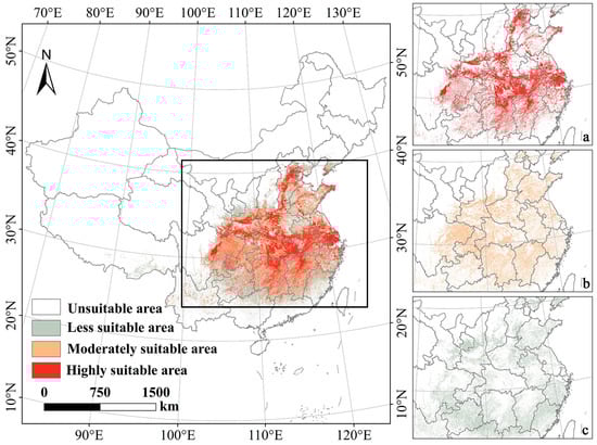 The suitable distribution area of Ginkgo biloba under the current climate scenario ((a) a highly suitable area; (b) a moderately suitable area; (c) less suitable areas).