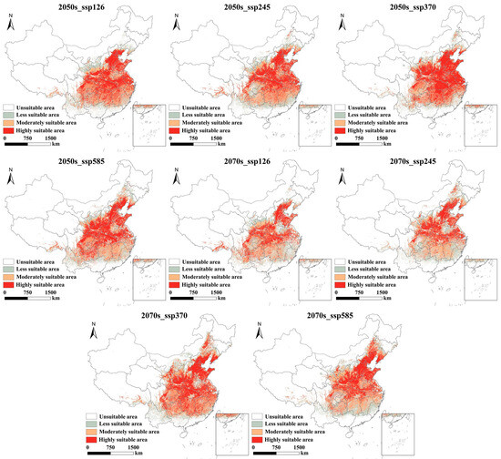 Using ArcGIS10.6, we divided the probability maps of Ginkgo biloba existence under different scenarios simulated by MaxEnt to obtain geographic distribution patterns of Ginkgo biloba under different climatic conditions in the future periods (Figure 6). The results show the range of potential future suitable area as significant, increasing by the 2050s period and 2070s period under different climate scenarios, and the potential future distribution focused in most of the south and part of the northeast is the geographic space migrate from the current 24°–41° N, 102°–124° E to the future range of 23°–48° N, 93°–126° E. In addition, under the 2070s_ssp370 climate scenario (Table 3), the Ginkgo biloba total suitable area may reach a maximum area of 326.87 × 104 km2, which increases by 112.68 × 104 km2, and the growth ratio reaches 52.61%. While in the future 2070s_ssp126 climate scenario, the total suitable area maybe the smallest (247.71 × 104 km2), it also increased compared with the current total suitable area of Ginkgo biloba with an increase of 33.52 × 104 km2 and a percentage of 15.56%. Then, based on the climate change, the highly suitable area tends to move northward (Figure 6), which might be because the increase in rainwater in the south inhibited the growth of Ginkgo biloba; on the contrary, increasing temperatures in the north promote its growth.
