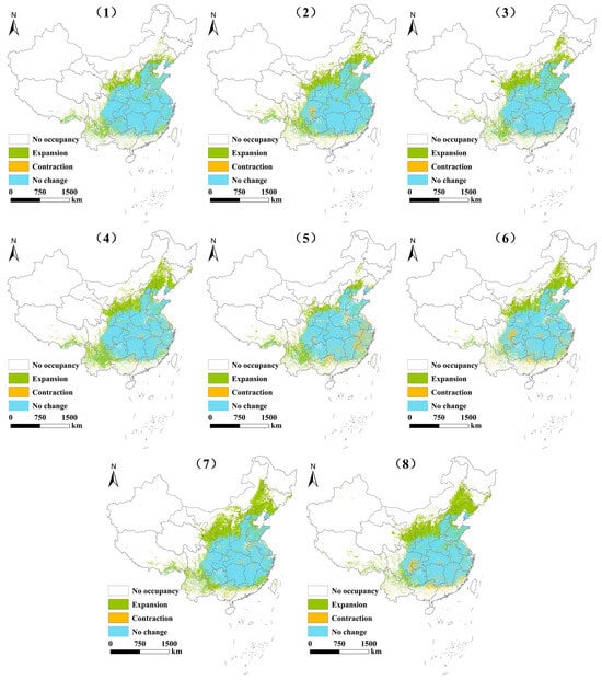Possible changes of the suitable area of Ginkgo biloba in the future (Note: Ginkgo biloba suitable areas in different scenarios in the 2050s and 2070s period are compared with the current period: (1) Changes in the current period to the 2050s_ssp126 climate scenario; (2) Changes in the current period to the 2050s_ssp245 climate scenario; (3) Changes in the current period to the 2050s_ssp370 climate scenario; (4) Changes in the current period to the 2050s_ssp585 climate scenario; (5) Changes in the current period to the 2070s_ssp126 climate scenario; (6) Changes in the current period to the 2070s_ssp245 climate scenario; (7) Changes in the current period to the 2070s_ssp370 climate scenario; (8) Changes in the current period to the 2070s_ssp585 climate scenario).
