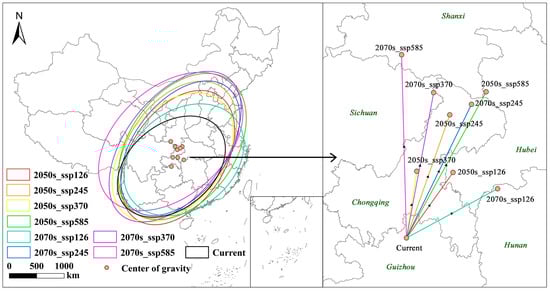 To understand the trend of the Ginkgo biloba suitable area in the future, we used the mean center of gravity and standard deviation ellipse tool in ArcGIS 10.6 to obtain the possible center of gravity and direction of distribution of the Ginkgo biloba suitable area under each scenario (Figure 8). From Figure 8, the center of gravity of Ginkgo biloba distribution is currently in the northern part of Guizhou Province (107.5° E, 28.7° N). In the ssp126 scenario, the center of gravity of Ginkgo biloba distribution may move northeastward to the southwestern part of Hubei Province (108.7° E, 30.1° N) by the 2050s, and to the northern part of Hunan Province (109.9° E, 29.7° N) by the 2070s. Under the ssp245 scenario, the center of gravity of Ginkgo biloba distribution in the next two periods may move to the northeastern part of Chongqing City. Under the ssp370 scenario, the direction of movement of the Ginkgo biloba suitable area in the 2050s and 2070s might be approximately the same, with the difference that the center of gravity may move to central Chongqing City (107.8° E, 30.1° N) in the 2050s and to northeastern Sichuan Province (108.3° E, 31.9° N) in the 2070s. Under the ssp585 scenario, the center of gravity of the Ginkgo biloba suitable area in the 2050s may move approximately to the boundary of Hubei Province, Shanxi Province and Chongqing City (109.7° E, 31.8° N), and the center of gravity of the Ginkgo biloba suitable area in the 2070s may move to the southwestern part of Shanxi Province (107.4° E, 32.7° N). In summary, the center of gravity of Ginkgo biloba may shift by 2.4° in longitude and 4° in latitude under different climatic scenarios in the above two periods. The direction of their movement remains largely consistent, all moving northeastward. In addition, according to the standard deviation ellipse in Figure 8, the Ginkgo biloba suitable area may show a distribution from southwest to northeast, similar to the expansion direction of the Ginkgo biloba suitable area.