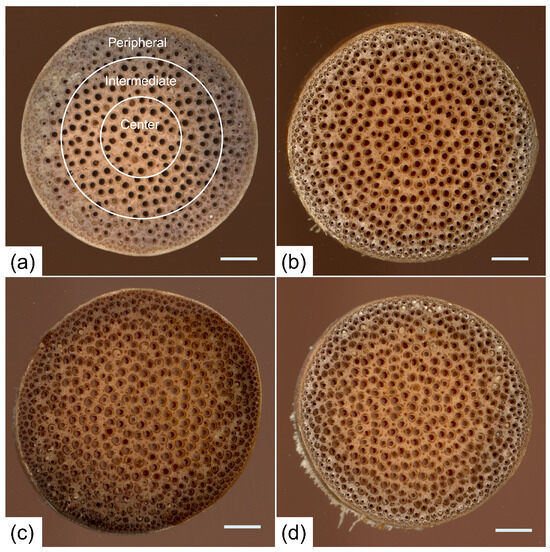 Figure 2 showed the scanned images of the complete cross-sections of the rattan stems at four different positions. The diameters of the rattan stems at different age stages were consistent, and the macroscopic appearance of the cross sections was very similar. The stem anatomy matched the typical structure of the monocotyledons: a single layer of cells formed an epidermis that covered the stem [29]. Vascular bundles were scattered throughout the ground tissue to provide support for the stem. In the center and intermediate parts, the vascular bundles were diffusely scattered, and the size and frequency of the vascular bundles were observed to be very similar. In contrast, the vascular bundles located at the peripheral part became visibly smaller and denser in distribution near the epidermis. Except for the area very close to the epidermis, the vascular bundles were evenly distributed in the ground tissue, and their sizes appeared to be very similar. The diameter and frequency of the metaxylem vessels had the same variation pattern as the vascular bundles.