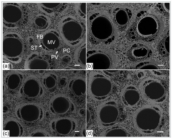 SEM images of C. caesius. (a–d), represent the intermediate cross-sections of the stem located at the BASE, 2-METER, MIDDLE, and TOP respectively. FB: fiber; MV: metaxylem vessel; PC: parenchyma; PV: protoxylem; ST: sieve tube. The scale bar was 100 m.