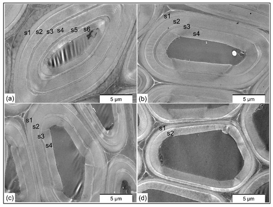 TEM images depicting the cross-sections of intermediate stem fibers from the base to the top. (a–d), represented the fiber wall layer characteristics at the BASE, 2-METER, MIDDLE, and TOP, respectively. S1∼S6 represented the number of secondary wall layers.