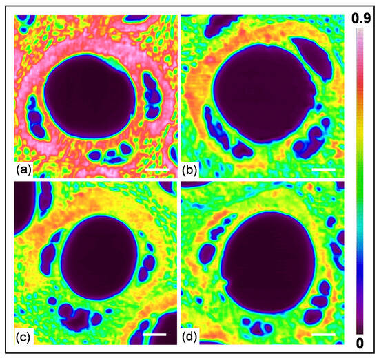 Distribution of total adsorption intensity of vascular bundles at different positions. (a–d), represent the intermediate cross-sections of the stem located at the BASE, 2-METER, MIDDLE, and TOP, respectively. The scale bar was 100 m.