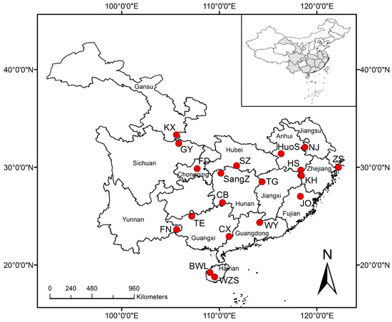 Geographical distribution of 19 L. formosana provenances. The location of each provenance is indicated by a solid red circle, and the black lines represent administrative divisions among different provinces in China.