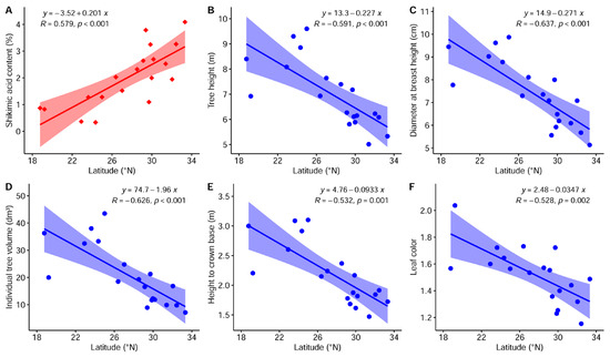 Linear relationship between shikimic acid content (A), tree height (B), diameter at breast height (C), individual tree volume (D), height to crown base (E), or leaf color (F) and latitude. A scatter plot for stem straightness degree in association with latitude is not shown due to the nonsignificant correlation between them. Kendall’s rank correlation coefficient (R), the p value, the regression equation and the 95% confidence interval are included for each plot.