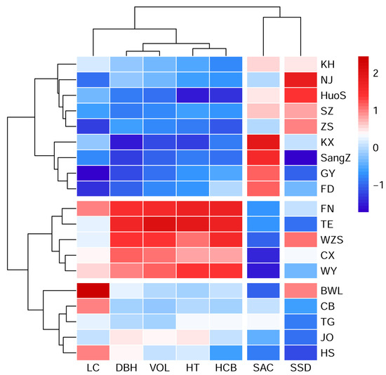 A clustering heatmap demonstrating the classification of 19 provenances was constructed on the basis of seven evaluated traits using Euclidean distance and the complete method (Figure 3). The clustering heatmap clearly distinguished all the provenances and divided them into three main groups. The first group included the provenances KH, NJ, HuoS, SZ, ZS, KX, SangZ, GY and FD with the highest average SAC (2.87%) at the group level, of which KX, SangZ and GY were the top three provenances (Tables S1 and S2). These nine provenances were located in the northern part of the distribution area of this species. The second group contained four provenances from the central region (CB, TG, JO, and HS) and one from the southern region (BWL) with the best SSD (mean: 2.92). The remaining five provenances (FN, TE, WZS, CX and WY), situated in the southern region with the largest average tree size (7.89 m for HT, 8.13 cm for DBH, and 26.98 dm3 for VOL) and the reddest autumn leaves (mean: 1.88), but the lowest SAC (mean: 0.87%), were assigned to the third group.