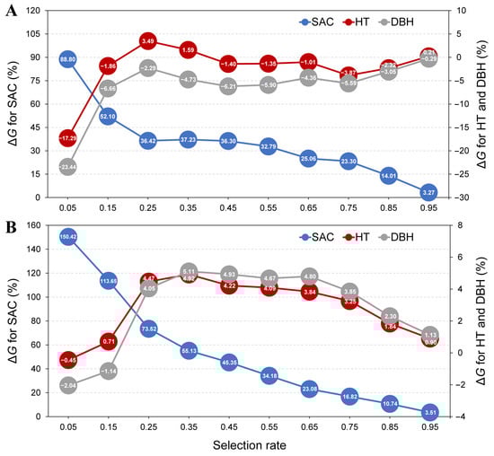 Genetic gains (ΔG) for shikimic acid content (SAC), height (HT) and diameter at breast height (DBH) under different selection rates at the levels of provenance (A) and family (B).