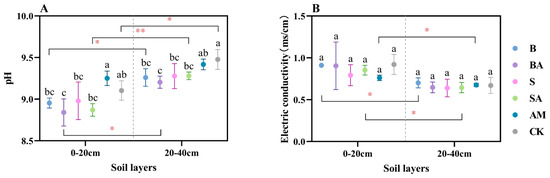 The results indicated that, excluding the S and AM treatments, the pH of the soil in the 20–40 cm layer was significantly higher compared with the 0–20 cm layer (p < 0.05) (Figure 1A). Conversely, the electrical conductivity of the soil in the 20–40 cm layer was significantly lower under the B, SA, and AM treatments in contrast to the 0–20 cm layer (p < 0.05) (Figure 1B).