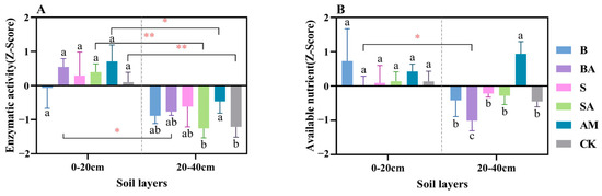 Variations in enzyme activities (Z-score) and available nutrients (Z-score) between soil layers and soil amendments. (A) Changes in enzyme activities (Z-score) between soil layers and soil amendments; (B) changes in available nutrients (Z-score) between soil layers and soil amendments. The interpretations of the letters, error bars, and asterisks are consistent with Figure 1. Abbreviations: B, biochar on its own; BA, biochar mixed with AMF; SA, straw mixed with AMF; S, straw on its own; AM, AMF on its own; CK, no additive.