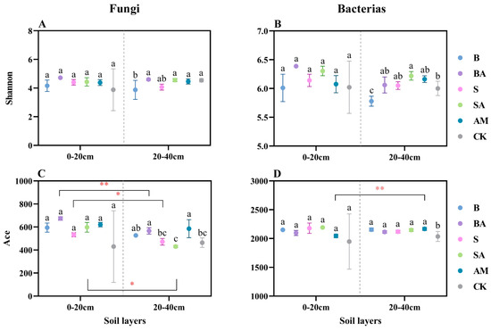 Compared with the CK in the 20–40 cm soil layer, the B amendment decreased both fungal and bacterial Shannon indices, whereas the SA amendment increased the bacterial Shannon index (p < 0.05) (Figure 3A,B). Meanwhile, in the 20–40 cm soil layer, the fungal ACE index was higher under the BA and AM amendments than for the CK (p < 0.05) (Figure 3C), and all five soil amendments increased the bacterial ACE indices, in contrast to the CK (p < 0.05) (Figure 3D).