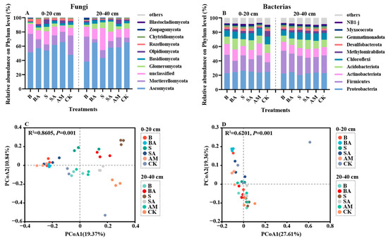 Variations in relative microbial abundance between soil layers and amendments. (A) Changes in relative fungal abundance at phylum level between soil layers and soil amendments; (B) changes in relative bacterial abundance at phylum level between soil layers and soil amendments; (C) principal coordinate analysis plot displaying the Bray–Curtis distance of fungi; (D) principal coordinate analysis plot displaying the Bray–Curtis distance of bacteria. Abbreviations: B, biochar on its own; BA, biochar mixed with AMF; SA, straw mixed with AMF; S, straw on its own; AM, AMF on its own; CK, no additive.