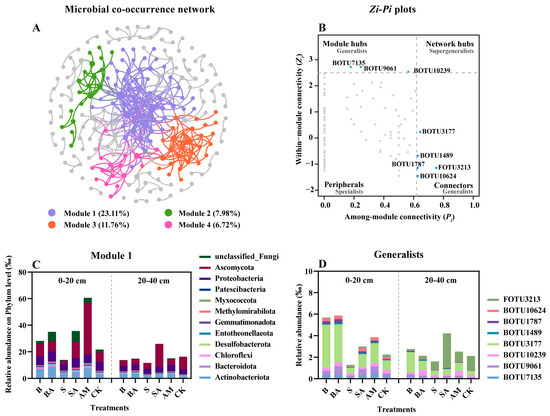 The microbial network contained a total of 238 nodes and 441 linkages, with BOTU9061 having the maximum degree. Module 1 accounted for 23.11% of the co-occurrence microbial network, and its dominant phylum was Ascomycota (Figure 5A). Among them, the relative abundance of Ascomycota under the AM amendment was highest in the 0–20 cm soil layer, while that under the SA amendment was highest in the 20–40 cm soil layer. Further, in Module 1, the relative abundances of Actinobacteriota under the soil amendments were higher than those of the CK for both soil layers (Figure 5C).
