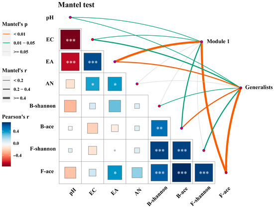 The Mantel test revealed that there was a significant correlation between the Module 1 community and various soil properties such as pH, electrical conductivity, enzyme activities, and bacterial and fungal Ace indices. Meanwhile, the generalist community was strongly related to the soil pH, electrical conductivity, enzyme activities, and microbial community alpha diversity (Figure 6).