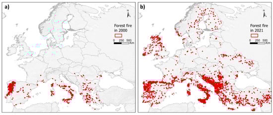 Burnt areas (≥30 ha) produced by forest fires in (a) 2000 and (b) 2021 based on the European Forest Fire Information System (EFFIS) data.
