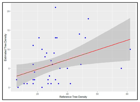 The reference versus estimated density of the tree density map produced using the ALS-derived tree registry, which includes trees of the DBH (diameter at breast height) class 2 (i.e., 21–34 cm). The red line represents the regression line, while the grey area illustrates the standard error.