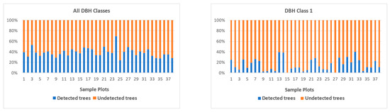 Graphs illustrating the percentage of detected and undetected trees in each sample plot as a result of the accuracy assessment of the general tree density map, which includes all DBH classes (i.e., all trees) and the three tree density maps, each of which includes trees of an individual DBH class (i.e., DBH class 1, DBH class 2, and DBH class 3, respectively).