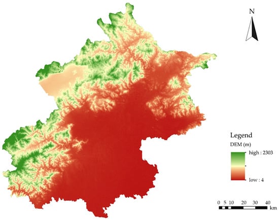 As China’ s political and cultural center, Beijing has 16 districts with a total land area of 16,410.54 km2. The population of Beijing reached 21.843 million in 2022. Beijing is located in the northwestern part of the North China Plain, surrounded by mountains on the western, northern, and northeastern sides (Figure 1). It has a typical temperate monsoon climate, with an average annual temperature of 12.77 °C, an average annual precipitation of 548.86 mm, and an average annual evaporation of 1785 mm. The Yongding River, the Chaobai River, the North Canal, the Daqing River, and the Jihe Canal form the major river system in Beijing. Forest and cropland are the most typical ecosystems in Beijing. The forest coverage rate reached 44.8% in 2022, and the typical vegetation is deciduous broadleaf forest and warm coniferous forest []. In recent years, the contrast between rapid social-economic development and the decline in ecological and environmental quality has become increasingly severe.