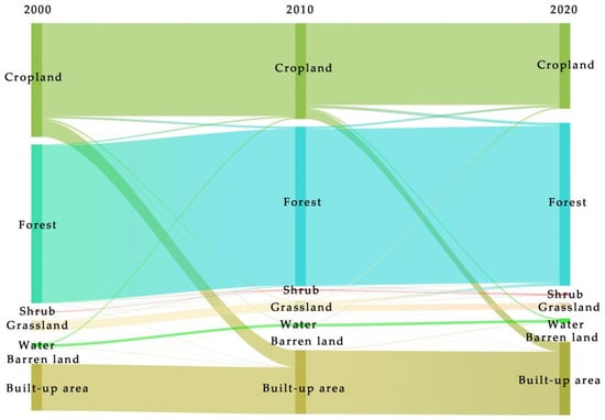 The Sankey diagram of land-use conversion in Beijing from 2000 to 2020.