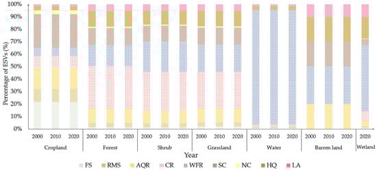 The percentage of ESVs of each land-use type in Beijing from 2000 to 2020 (FS: food supply, RMS: raw material supply, AQR: air-quality regulation, CR: climate regulation, WFR: regulation of water flows, SC: soil conservation, NC: nutrient cycling, HQ: habitat quality, LA: landscape aesthetics).