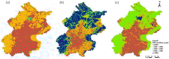 The spatial distribution of the total ESV in Beijing from 2000 to 2020 (a) 2000, (b) 2010, (c) 2020.