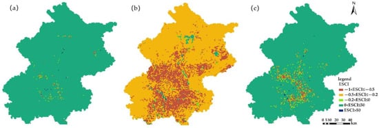 The ESCI distribution in three periods (2000–2010, 2010–2020, 2000–2020) shows the spatial characteristics of gain (ESCI > 0) and loss (ESCI < 0) of the total ESV (Figure 6). During the first period, the ESCI values in 99.2% of the study area were greater than 0, indicating that the total ESV increased in almost all areas. However, the ESCI values in 98.2% of Beijing were lower than 0 from 2010 to 2020, which indicates the general loss of the total ESV. The area where ESV significantly decreased was the built-up area with high expansion intensity. The area with the gain of ESV from 2000 to 2020 covered 95.4% of the study area, and the loss of ESV was mainly distributed in the central urban area and southern part of Beijing.