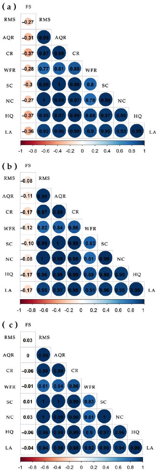 Spearman correlation analysis between the ES pairs in Beijing from 2000 to 2020 (p < 0.01), (a) 2000, (b) 2010, (c) 2020, FS: food supply, RMS: raw material supply, AQR: air-quality regulation, CR: climate regulation, WFR: regulation of water flows, SC: soil conservation, NC: nutrient cycling, HQ: habitat quality, LA: landscape aesthetics).