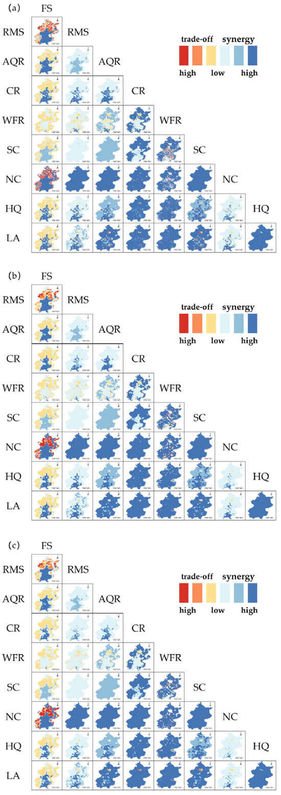 The spatial variability of regression coefficients of the ES pairs in Beijing (a) 2000, (b) 2010, (c) 2020, FS: food supply, RMS: raw material supply, AQR: air-quality regulation, CR: climate regulation, WFR: regulation of water flows, SC: soil conservation, NC: nutrient cycling, HQ: habitat quality, LA: landscape aesthetics).