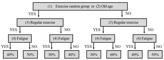 Those who answered “yes” to question (1) in Table 3 participated in the experiment after receiving confirmation from the doctor that they could proceed with the walking exercise. The experiment was conducted safely by setting the exercise intensity according to the steps listed in Figure 1.